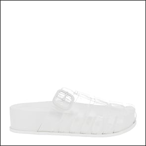 Digital creator and stylist Eve Lily is known for her bold, colourful and impossible-to-miss personal style. She accessorises a puff-sleeved, voluminous pink dress with our fun and trendy Madison caged see-through slide sandals in deep purple. To make these eye-catching jelly shoes stand out even more, she wears them with graphic socks for a playful look.