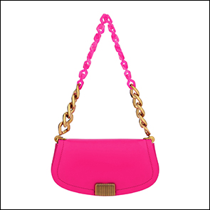 Stylist and creative director Emili Sindlev creates a quirky and eclectic look with pink and purple. Wearing a sports jacket with a flower motif with baby pink trousers, she completes her outfit with the Sonnet chain-handle shoulder bag in brilliant fuchsia and the purple Madison caged see-through slide sandals — which she wears with pink printed socks.