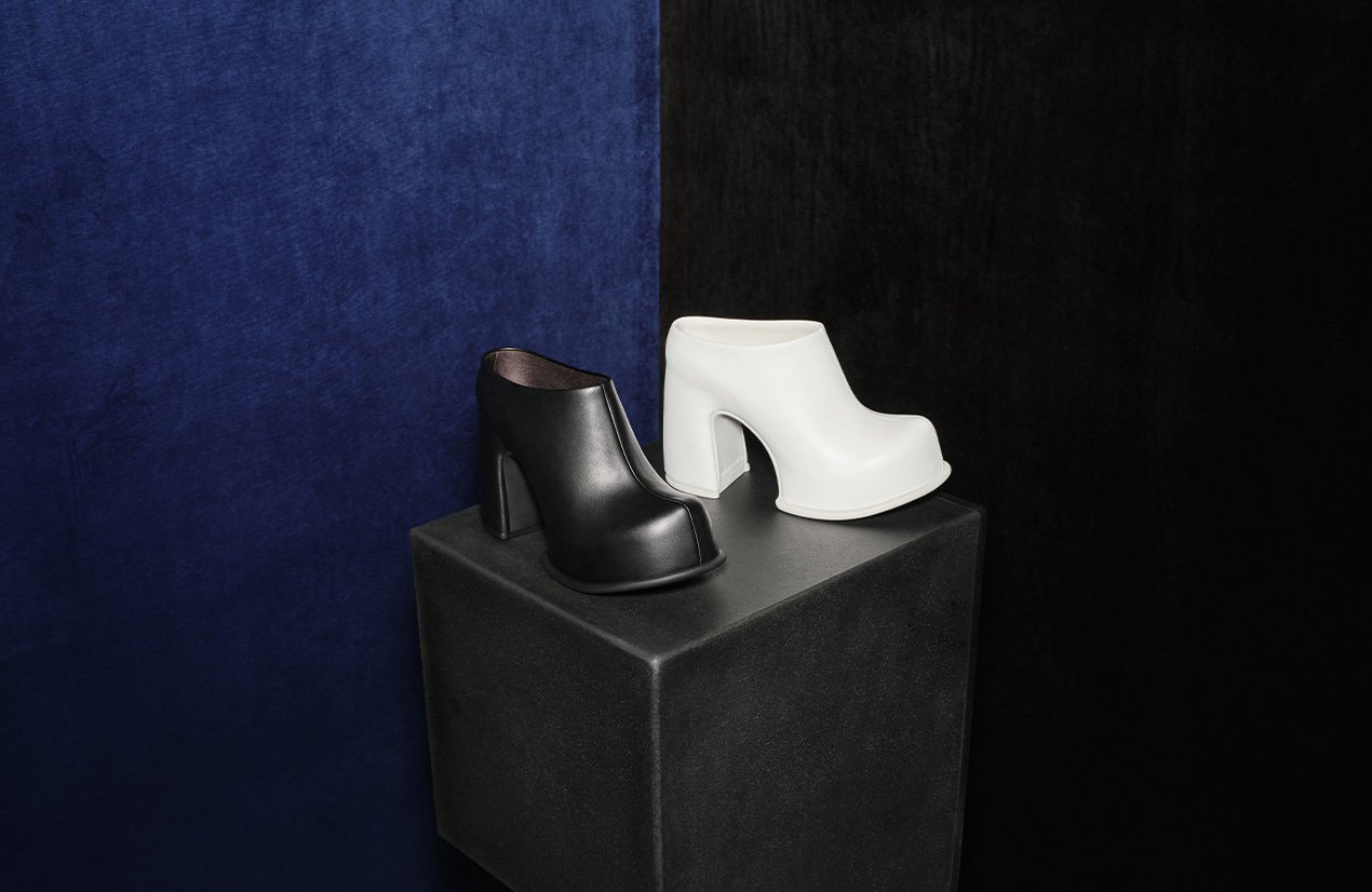 The Pixie series of standout shoes takes centre stage this season. Platform heels are translated into three different silhouettes: an ankle boot, a sculptural mule, and a Mary-Jane pump. All three forms are based on the natural shape of the foot — sleek, clean-lined and devoid of details, these visually compelling shoes feature padded uppers that are fully lasted over their impressive chunky heels and platform soles, creating a sharp, austere aesthetic that is decidedly modern.