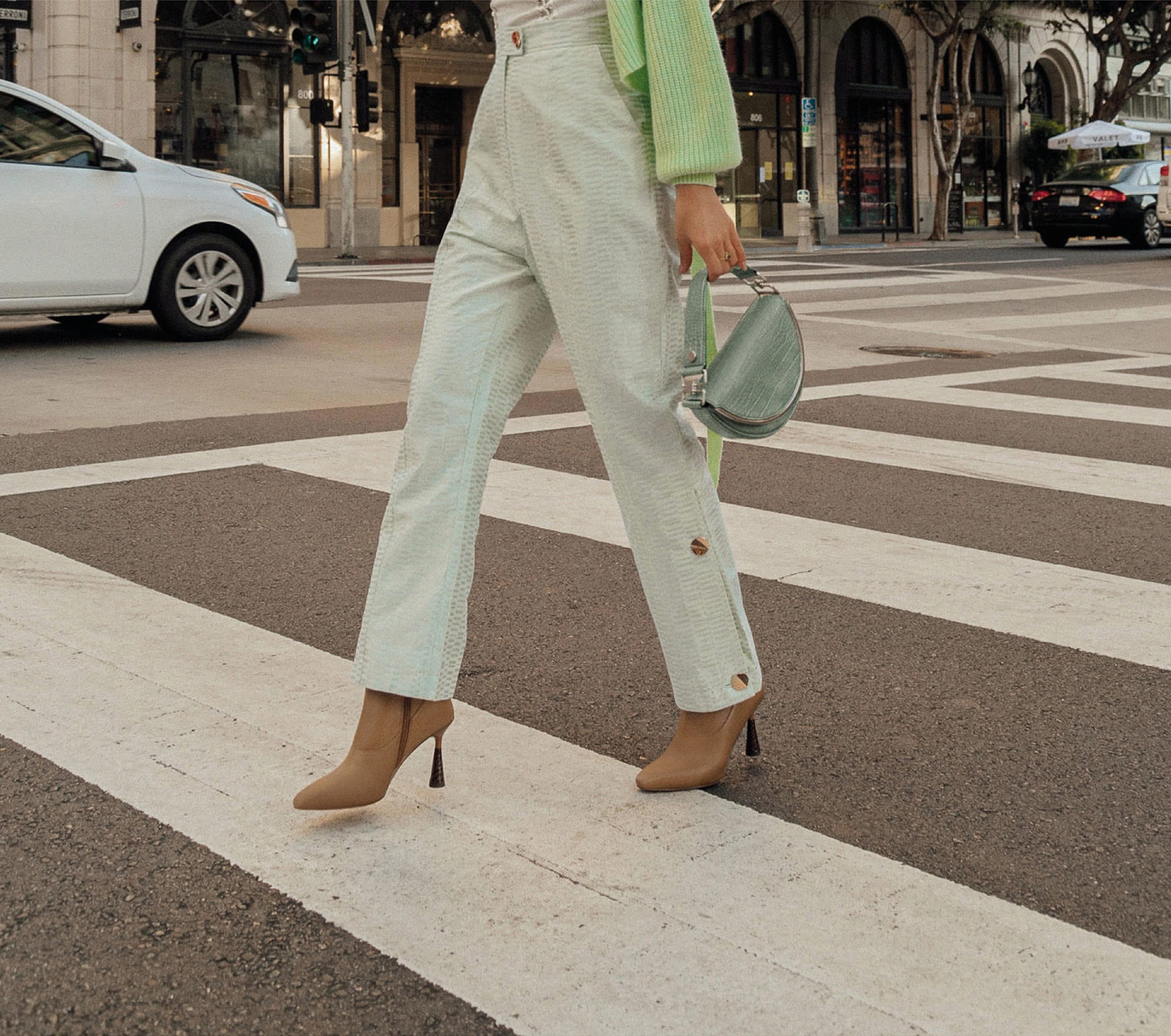 Nature-inspired colours are a major trend for Spring/Summer 2020 and Alyssa Coscarelli is one step ahead of the fashion curve. Dressed in a moss green check blazer, the fashion writer kept her look polished with carefully chosen accessories, including our semi-circle top handle bag and pointed-toe wedge mules.