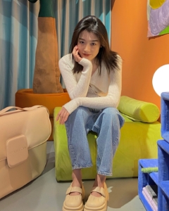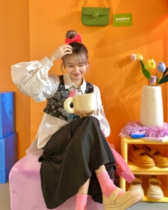 Pastels will always be in style during spring time. Ha You Jin puts together a fun and colourful outfit with a mint green top, lilac socks, and accessories in butter yellow.