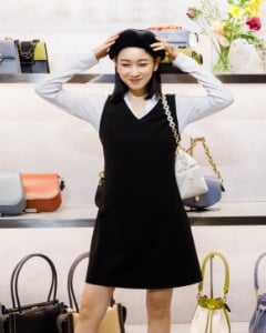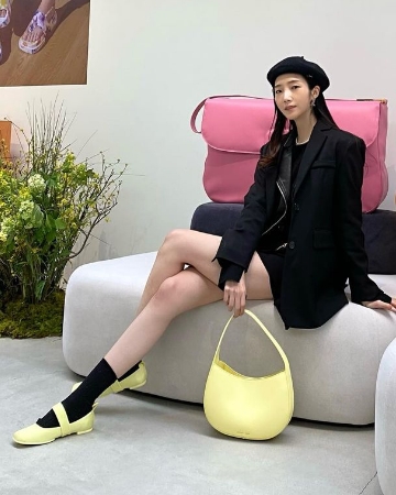 Fashion model Kim Min Sun creates an eye-catching visual contrast by accessorising her all-black outfit with our yellow Coda bag and Nori Mary Jane flats.
