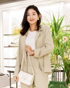 Noel Lin gives her all-white outfit some depth by reaching for the sand-coloured Blair chain handle bag from our Spring 2022 collection.