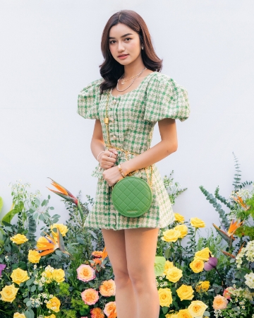 Alyna Somnang made her green check dress stand out more by accessorising it with our matching circle bag.