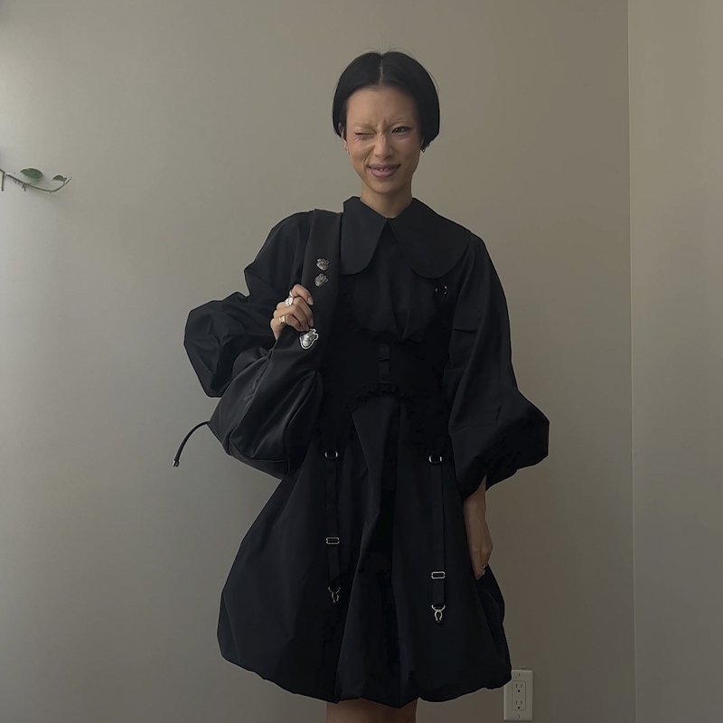 Model Judes demonstrates the creative possibilities of always-stylish all-black outfits by matching the CHARLES & KEITH X HENN KIM illustrated heart charm ruched hobo bag and illustrated heart charm ankle boots to three different monochromatic looks. These statement-making accessories look particularly captivating when paired with a girlish yet sophisticated bubble-skirted puff-sleeved dress.
