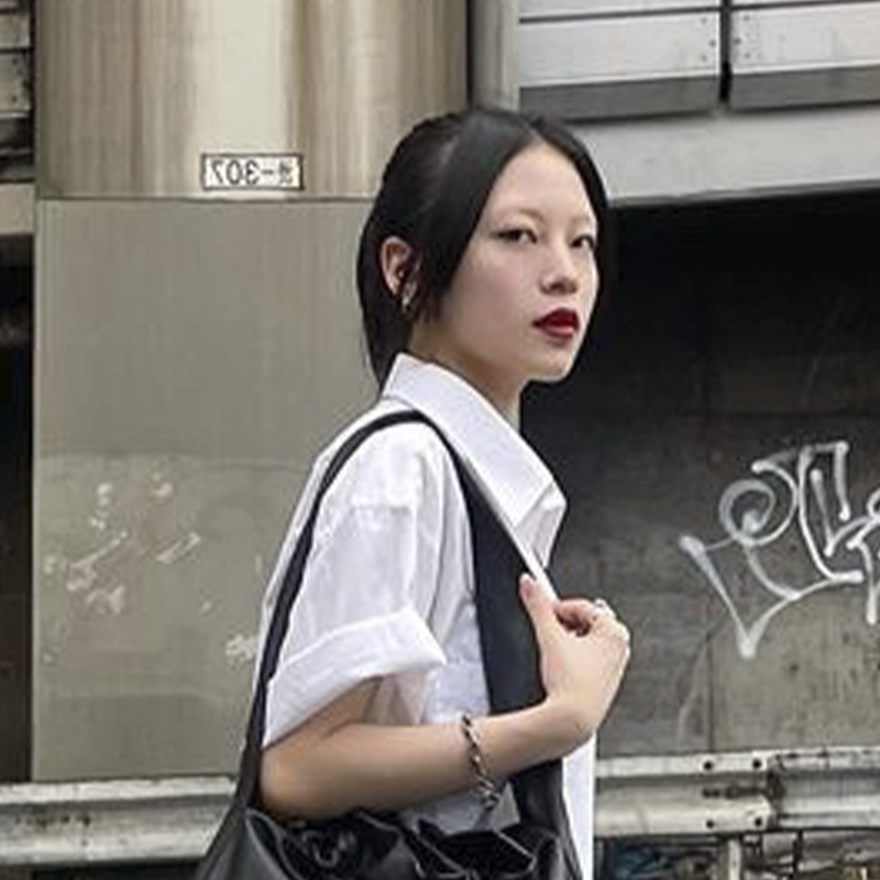 Japanese model Kureha looks cool and youthful in a schoolgirl-inspired look consisting of a white shirt and black mini skirt, as well as the CHARLES & KEITH X HENN KIM illustrated heart charm ruched hobo bag and illustrated heart charm ankle boots — in glossy black, these accessories and their silver-toned embellishments give visual interest to her pared-back ensemble.