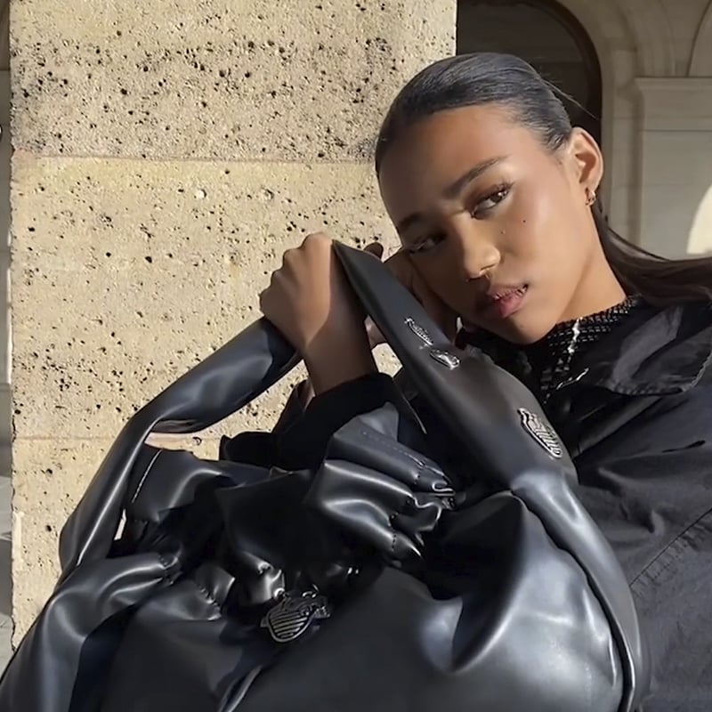 Belgian-American actress Olivia Rouyre steps out in a cool and chic all-black ensemble. Featuring the CHARLES & KEITH X HENN KIM illustrated heart charm ruched hobo bag and illustrated heart charm ankle boots in glossy black, her outfit is understated yet striking, thanks to the eye-catching details of her accessories.