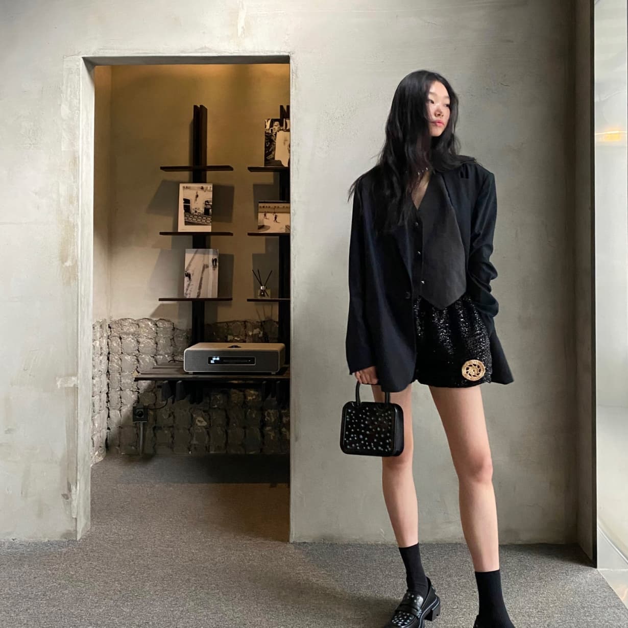Actress @lamting brightens up her chic all-black ensemble with the hopeful blue daisies on the Perline embroidered chunky penny loafers and sculptural tote bag from our #CocoCapitanxCharlesKeith collection.