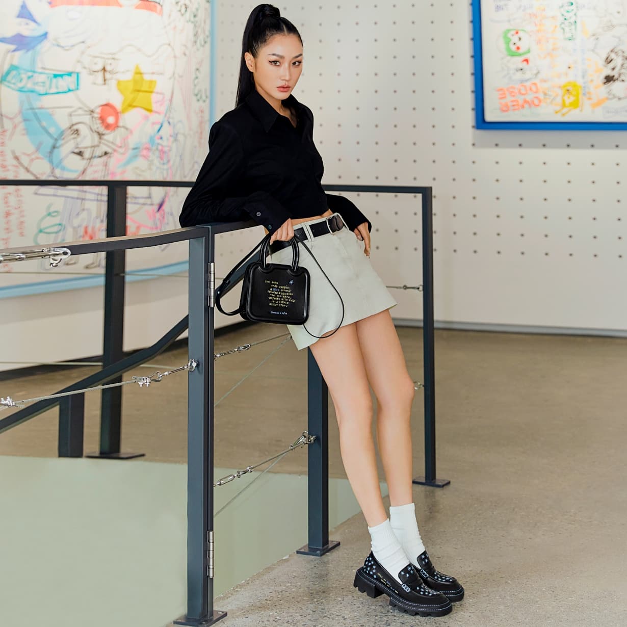 South Korean model @mulan_bae complements her chic and modern all-black outfit with the whimsical Perline embroidered chunky penny loafers and sculptural tote bag from our #CocoCapitanxCharlesKeith collection.