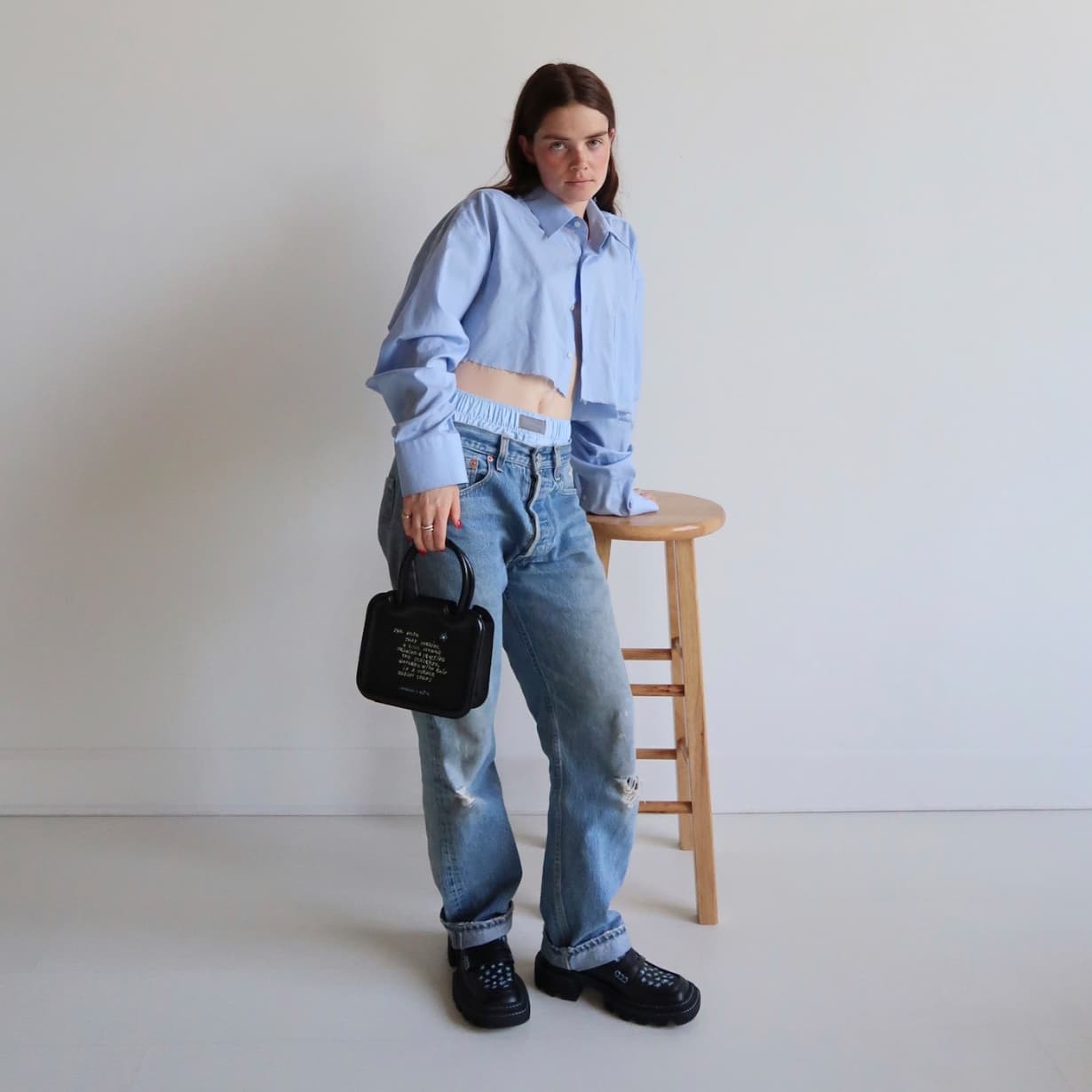 Dressed in a cropped button-up shirt and loose-cut jeans, digital content creator @double3xposure accessorises with the Perline embroidered chunky penny loafers and sculptural tote bag from our #CocoCapitanxCharlesKeith collection, which are wearable pieces of art.