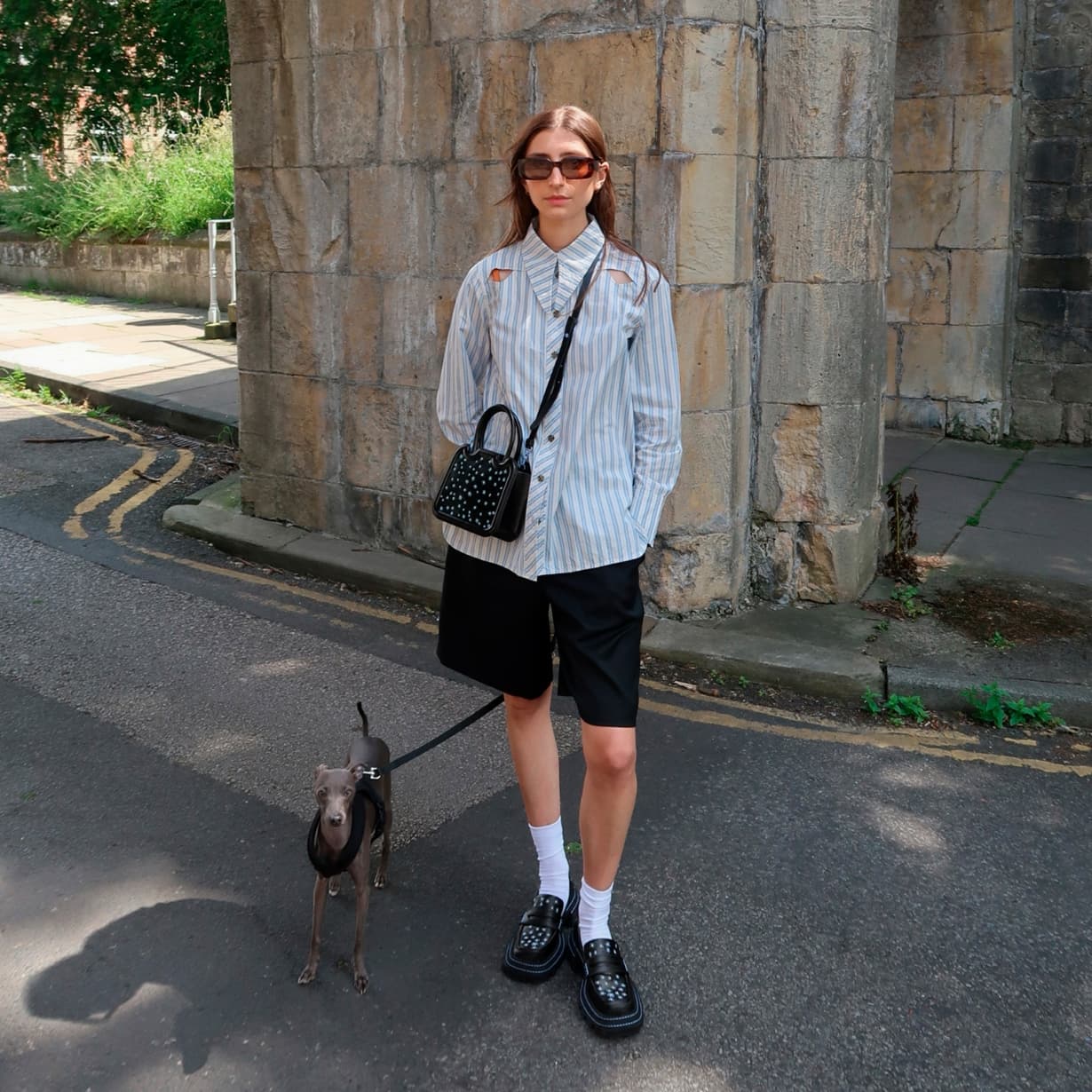 Content creator, model and entrepreneur @sarahlysander accessorises a cool and chic over-sized white shirt with the Perline embroidered chunky penny loafers and sculptural tote bag from our #CocoCapitanxCharlesKeith collection.