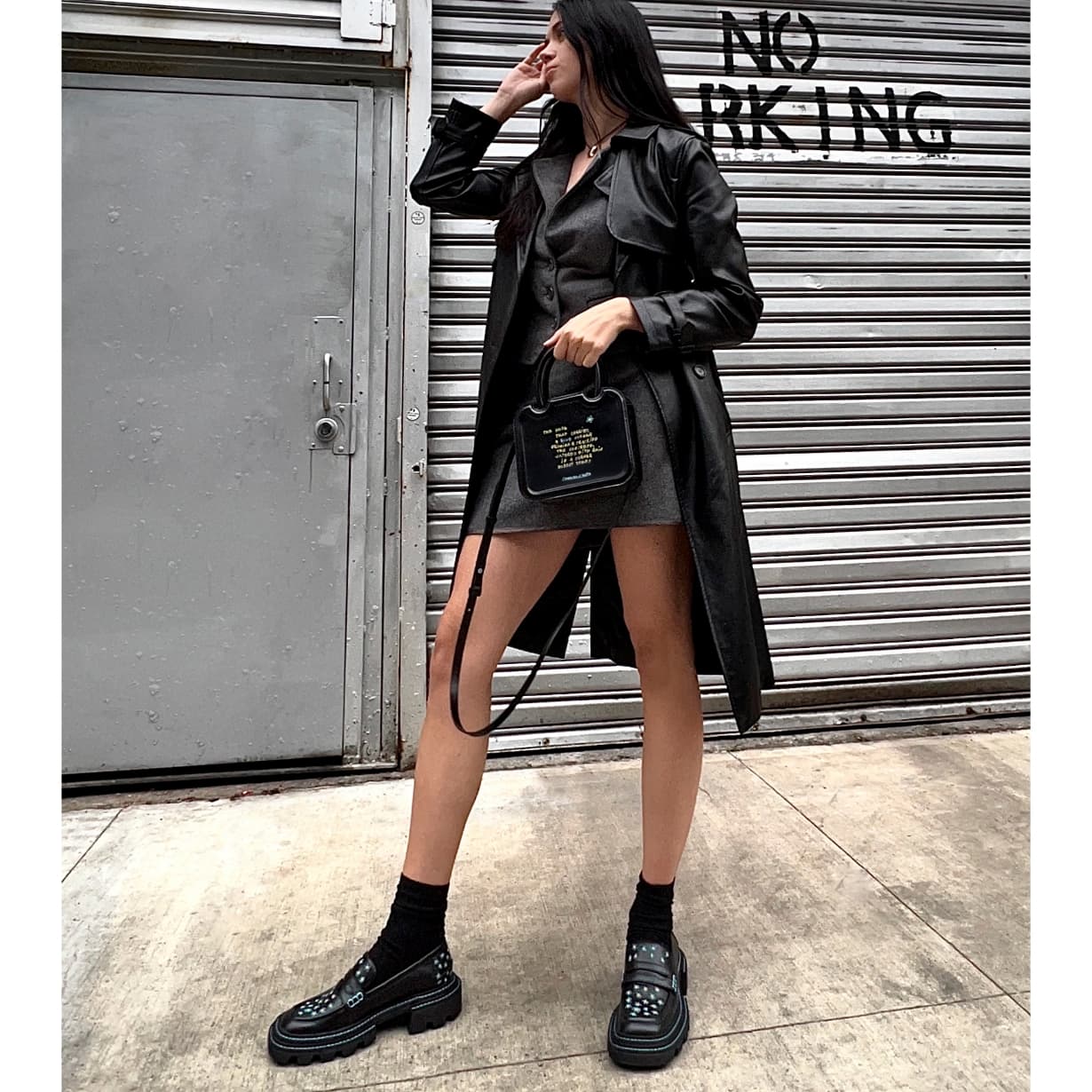 Stepping out in a street-chic, all-black ensemble, digital content creator @looseunicorns adds a quirky touch to her look with the playful Perline embroidered chunky penny loafers and sculptural tote bag from our #CocoCapitanxCharlesKeith collection.
