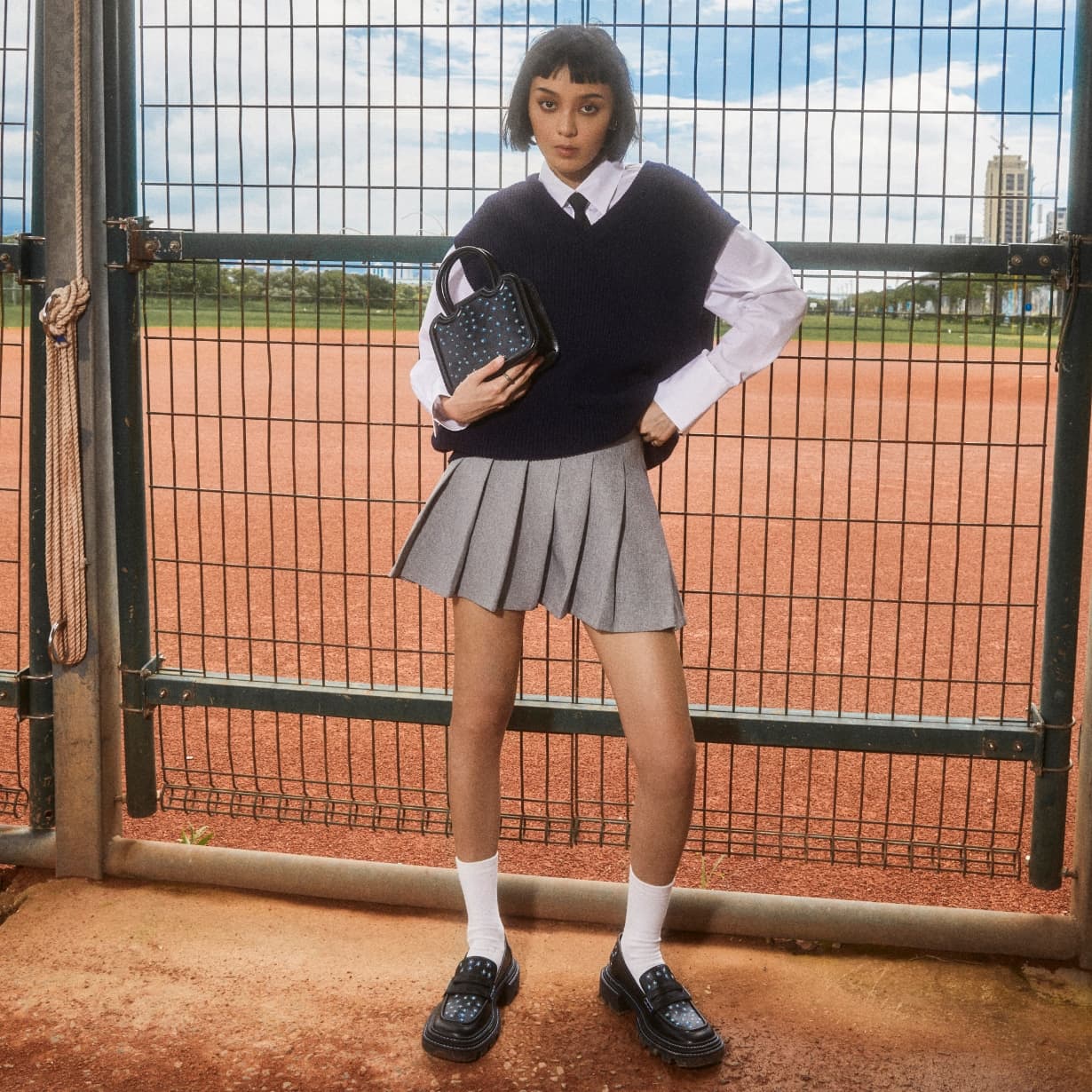 Taiwan-based model & influencer @kiwileehan completes her preppy look with the Perline embroidered chunky penny loafers and sculptural tote bag from our #CocoCapitanxCharlesKeith collection — they have a charming, child-like quality.