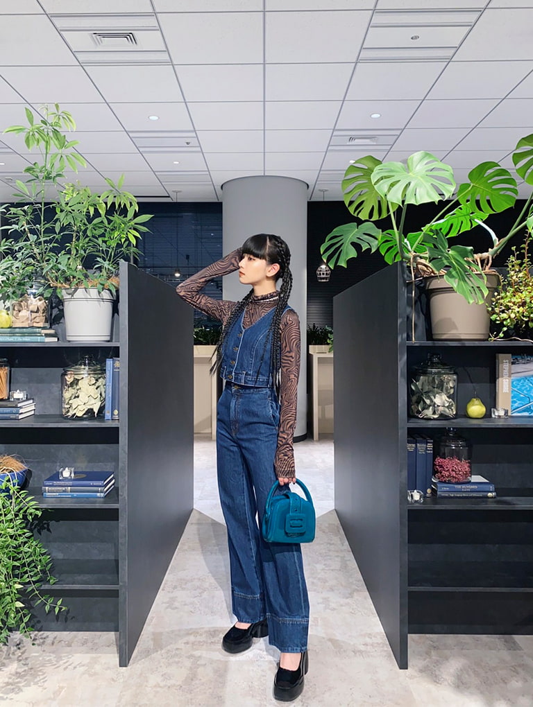 Japanese model Hina creates a casual yet polished outfit with choice picks from our Lula range. Layering a denim co-ord set — featuring a cropped vest and wide-legged pants — over a sheer, printed long-sleeved top, she completes her fashion-forward outfit with our Lula patent chunky heel pumps in black and Lula patent belted bag in turquoise. The luxurious sheen of the Lula pieces elevates her smart-casual look.
