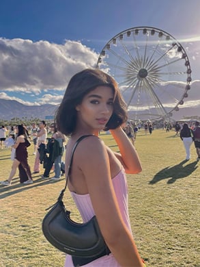 The content creator opted for a clean white halter-neck dress, radiating boho-chic vibes — a timeless choice for the festival scene. She accessorised the ensemble with the Petra curved shoulder bag, valued for its compact size and versatility. It seamlessly complemented every outfit she wore throughout the weekend.