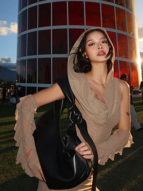 Caroline Hu’s Dune-inspired ruffle dress, featuring a draped neck and connected hoodie, made a bold fashion statement with its unique design. She paired it with the Toni curved hobo bag in timeless black to exude understated sophistication. Our metallic buckled ankle boots served as the perfect finishing touch to her outfit, helping her navigate the festival grounds effortlessly.