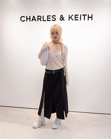 Influencer Rim Junhee accessorised her outfit with the Koa push-lock top handle bag and Pixie platform mules from the CHARLES & KEITH Fall 2023 collection.