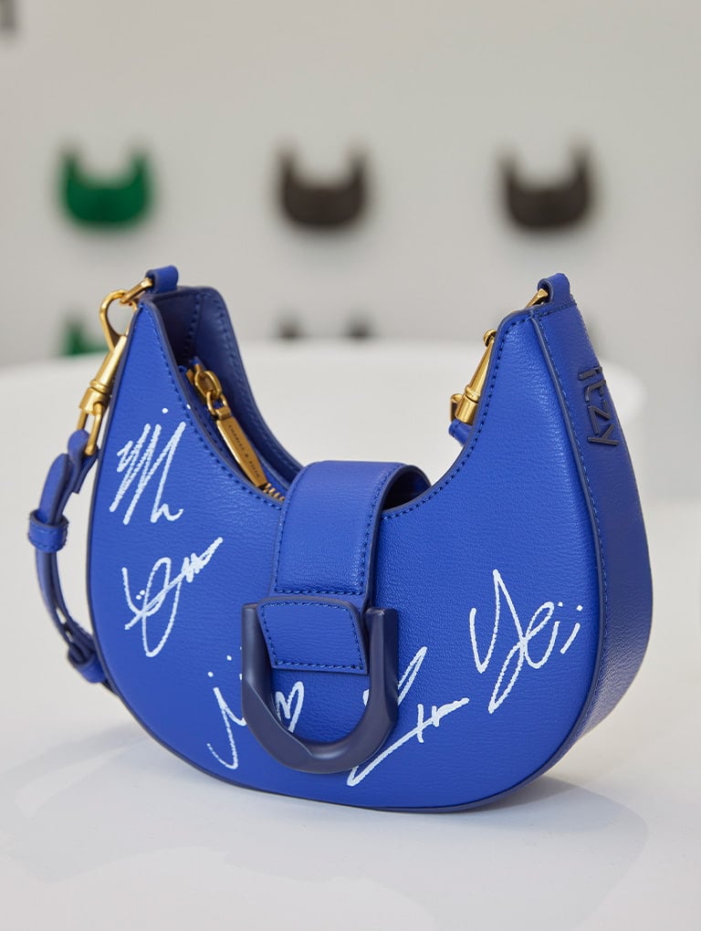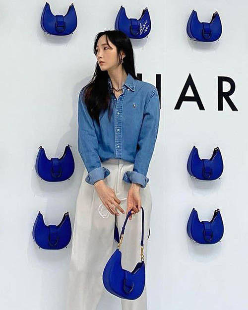 Looking relaxed and stylish in a denim shirt, white loose-cut trousers and Air Jordans, model Minsun chose the ITZY Gabine belted hobo bag in cobalt to put the finishing touch on her outfit. The bag’s rich, jewel-toned finish adds a standout element to her simple and chic look.