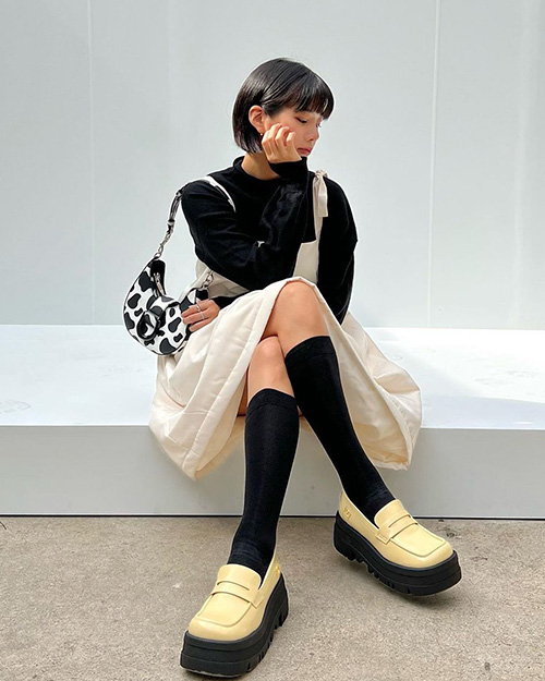 Leaning into the schoolgirl-inspired style, fashion blogger Hyuna paired the yellow ITZY Rainier chunky platform penny loafers with knee-high black socks. Cleverly using accessories to elevate her minimalist black-and-cream outfit, she finished off her look with the ITZY Gabine belted hobo bag in a quirky cow print.