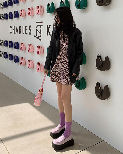 To create an eye-catching colour-coordinated look, fashion influencer Hyunji Kim matched the lilac ITZY Rainier chunky platform penny loafers with purple socks. She also complemented the small pink flowers on her mini dress with the pink ITZY Gabine belted hobo bag to create a girlish and quirky ensemble.