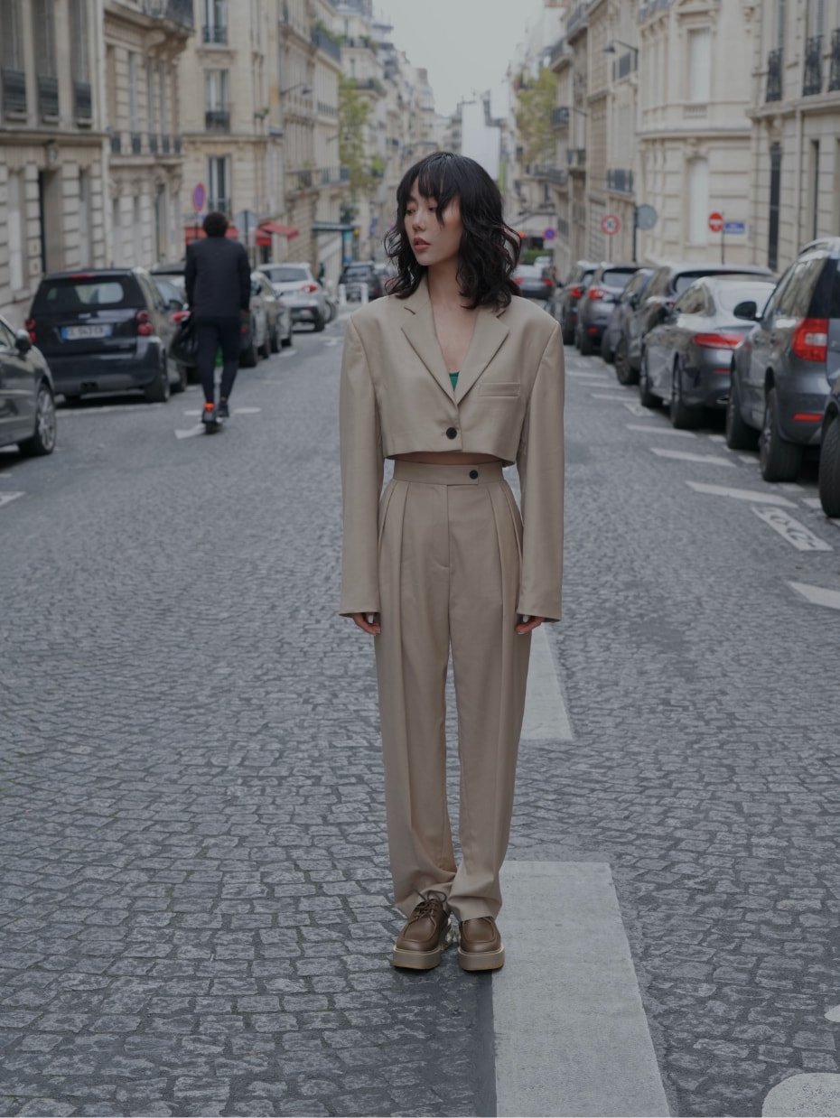 Model and influencer Xiayan matches Paris’ iconic buildings in a khaki suit set featuring an unconventional cropped blazer — she complement her unconventionally tailored ensemble with the Collette sculptural heel platform brogues. With their one-of-a-kind see-through block heels, they are head-turning statement shoes that are also incredibly versatile.