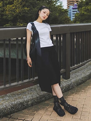 Lisa refreshed the timeless black-and-white look by getting creative with her accessories. Wearing the Toni tubular tie-around sandals with sheer socks, she completed her youthful ensemble with the form-meets-function Toni knotted curved hobo bag.
