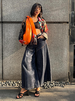 Trish Filart gave her outfit distinctive flair by playing around with shapes, colour and texture in her ensemble. The Toni curved hobo bag in orange drew attention to the warmer hues in her button-up, while the knotted straps of the Toni mules added visual interest to the overall look.