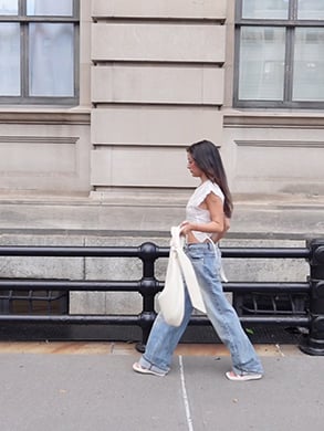 The content creator kept it light and breezy by pairing her denim with clean white accessories like the Toni curved hobo bag and the Toni puffy-strap wedges.