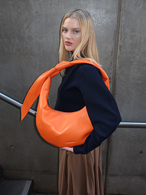 To add a pop of colour to her neutral-toned outfit, Elodie Russell stepped out with the Toni knotted curved hobo bag in impossible-to-miss orange on her shoulder — featuring a soft yet striking construction, this statement carrier is a treat to hold and behold.