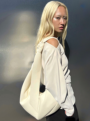 To make an understated visual impact, Dechen Grenfell paired a fluid white top with the Toni knotted curved hobo bag in tasteful chalk. This eye-catching combination matches Dachen’s blond hair perfectly to create a distinctive tonal look.