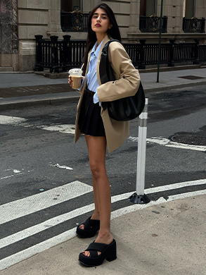 To add edgy elements to her classic preppy-inspired outfit, Natasha Narrina accessorised with the Toni knotted curved hobo bag and Toni puffy-strap crossover platform mules. These bold and modern pieces elevated her polished everyday look.