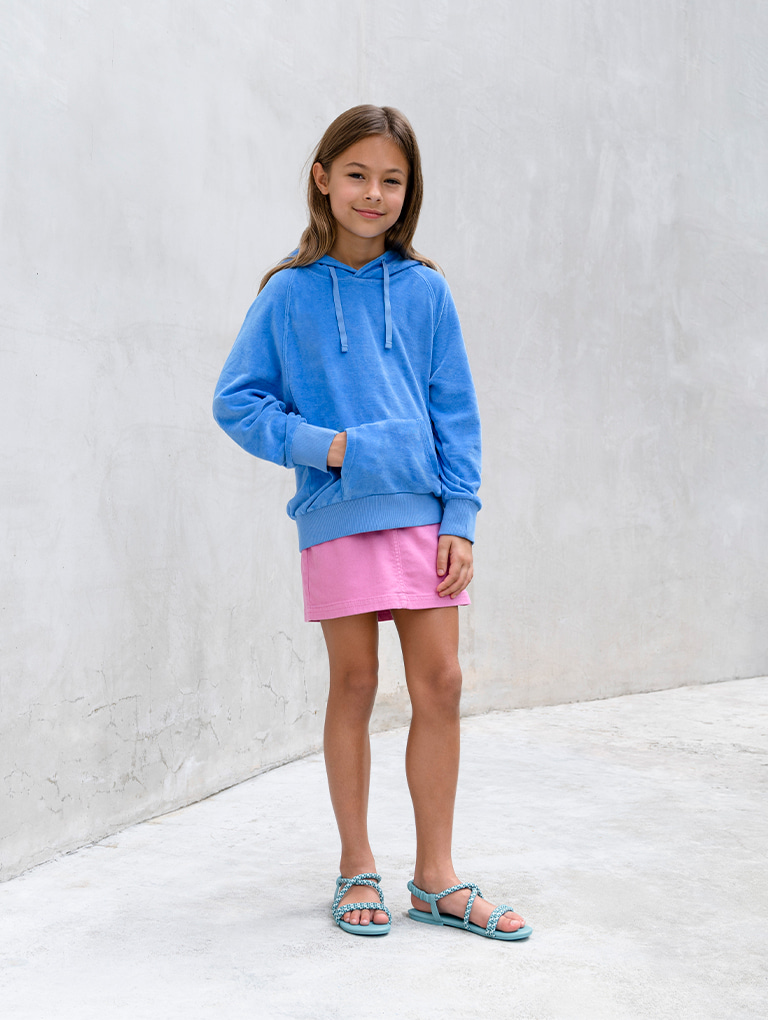 The hoodie is an athleisure staple and a favourite with children for their cosy comfort. Let your little one spend the day in a soft hooded pullover and a cute denim skirt — keep her look summery with our printed-rope slingback sandals in turquoise. These nautical-inspired shoes will keep her feet feeling cool, and are great for both indoor and outdoor play.