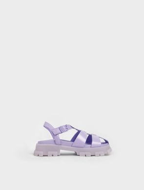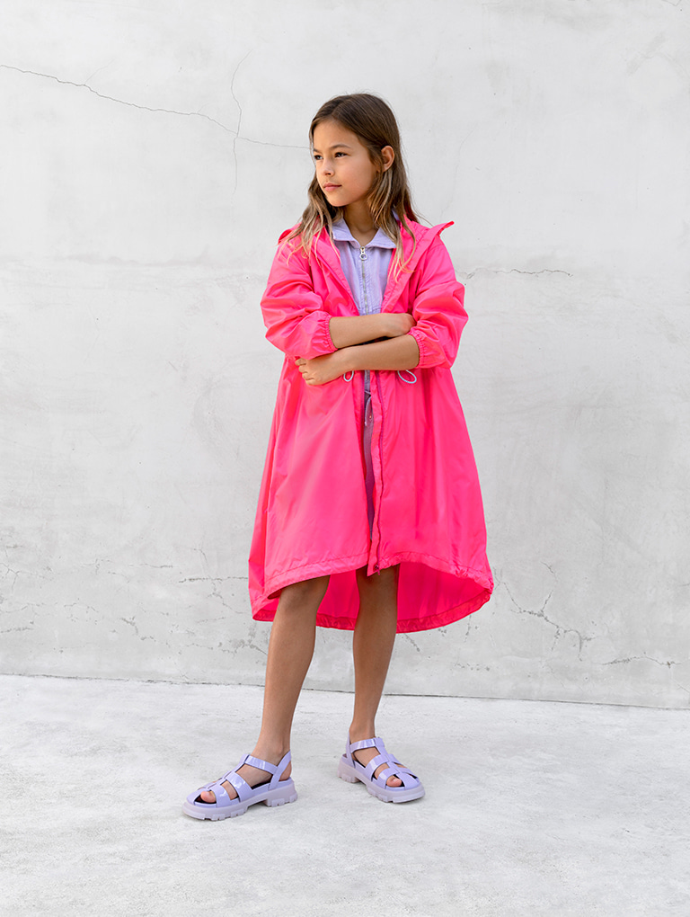 Create a chic and fun athleisure outfit for your little girl with bright, oversized outerwear. Add a subtle touch of shine with our new patent kids’ footwear. The patent cage sandals in sweet lilac balance out the intensity of a neon pink windbreaker. Create a pleasing coordinated look by pairing our green heart-motif clogs with a matching parka.