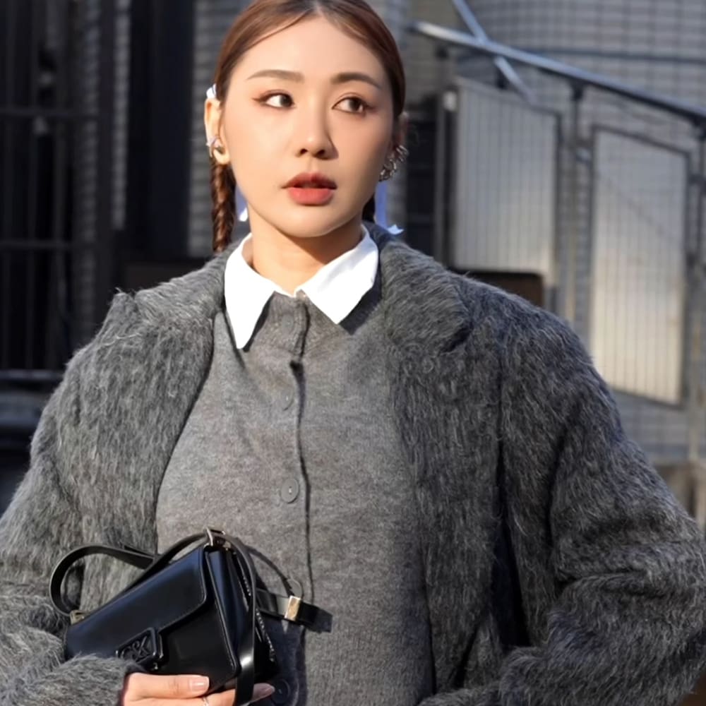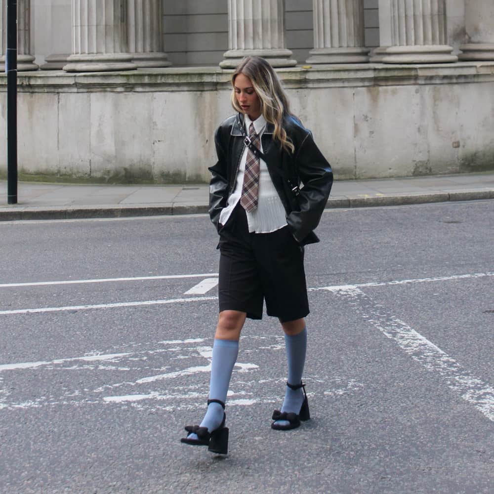 L'INITIAL: @mayho10 polished up her preppy-inspired look with our classic leather boxy bag and elegant leather buckled T-bar pumps, which she wore with socks to create a charming schoolgirl aesthetic.
