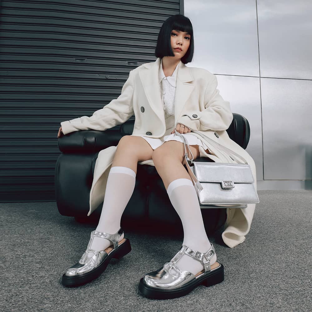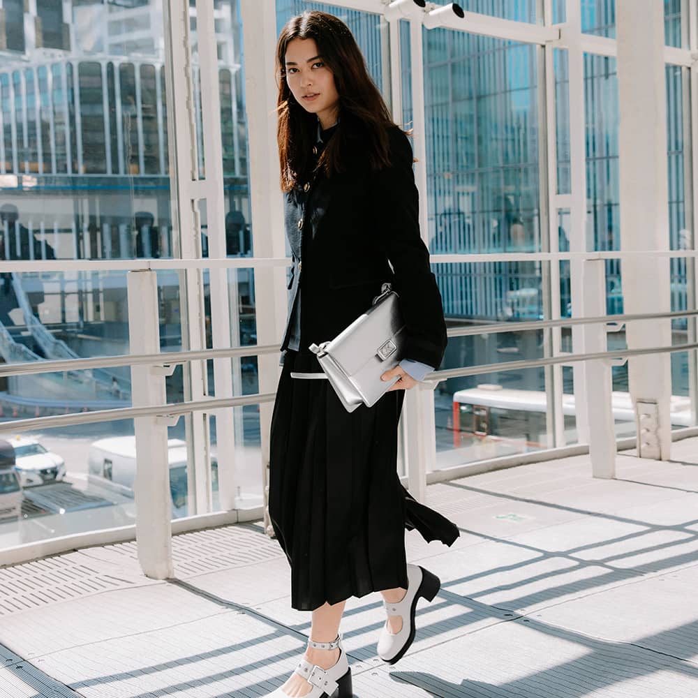 L’INITIAL: @dhevianabena elevates her monochromatic all-white look with our leather shoulder bag and cut-out T-bar sandals in shiny silver — the resulting ensemble is sharp and polished with a futuristic edge.