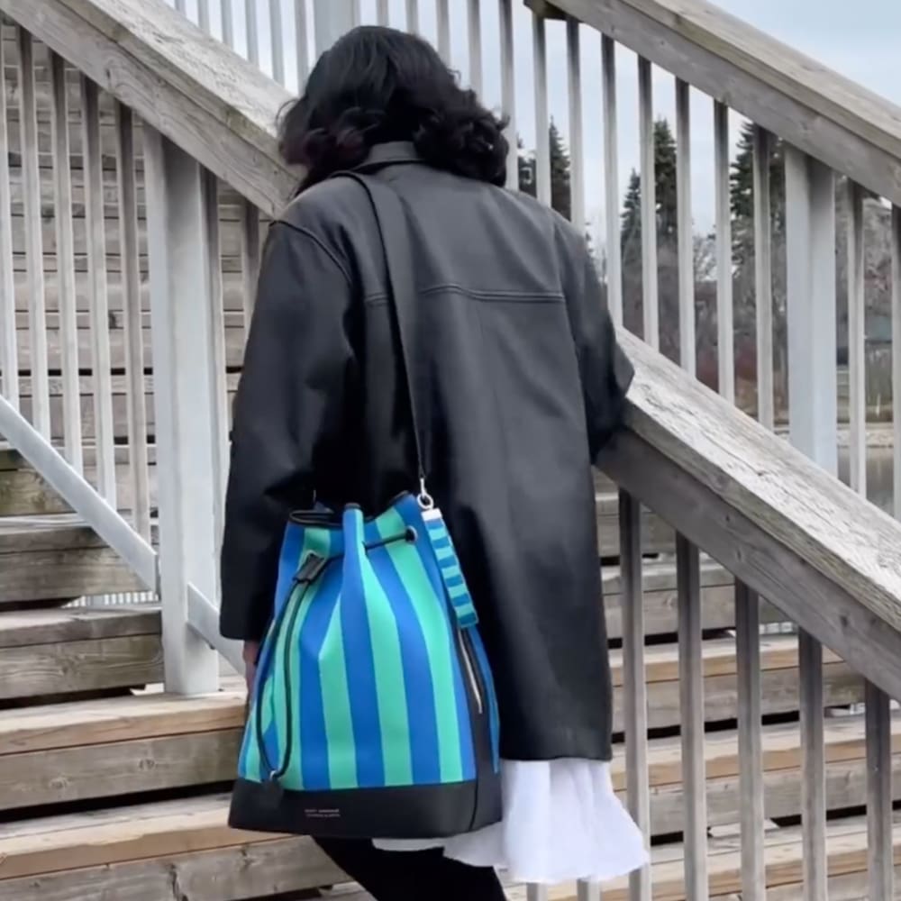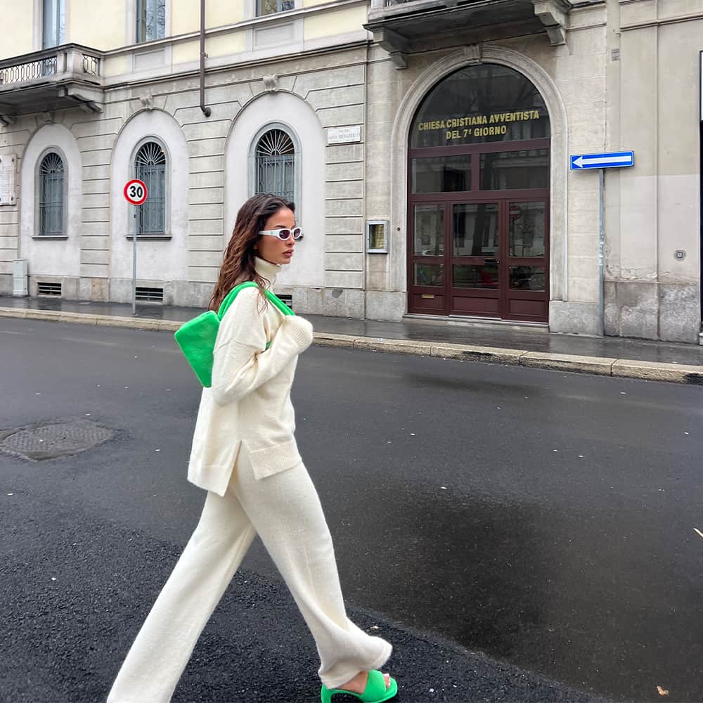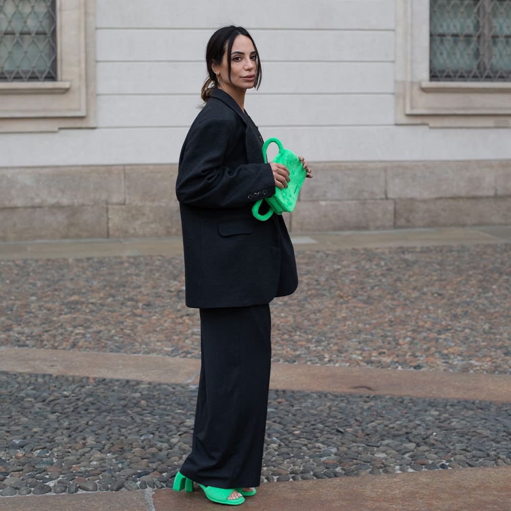 Julia Hussein pairs the bright green Loey accessories with a light neutral-toned outfit to create an airy look perfect for spring and summer.