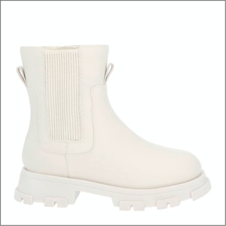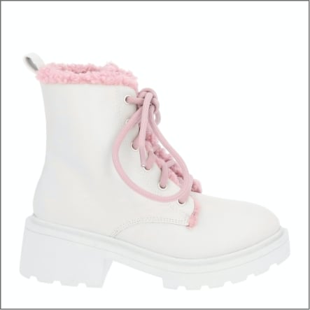 The chunky shoe trend has found its way into kids’ fashion as well — they are particularly well-suited for active little feet. Dressed in a street-chic outfit featuring a sweet white-and-lavender palette, Vivienne matches her look with our fur-trimmed chunky ankle boots. Mirroring her clothes, these eye-catching white boots come with pretty purple laces.